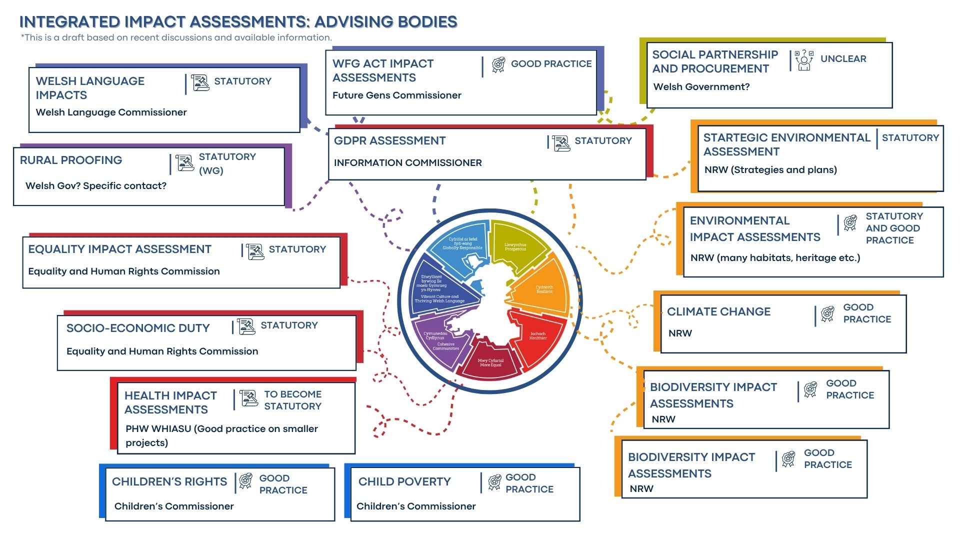 We hear that sometimes economic impacts are prevailing, this is why we need to ensure economic, social, environmental and cultural impacts matter equally. Different impact assessments have been created, and some imposed, to help maximise benefits for specific groups or the environment against disproportionate impacts and priorities. The Well-being of Future Generations Act provides a natural umbrella as it demands the pursuit of the 4 equal dimensions of well-being: the economy, our society, the environment and our culture.